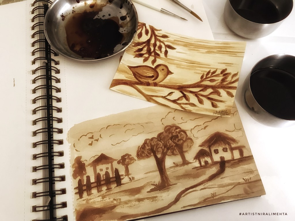 Second one is Coffee Painting. Yes! We can paint with coffee just like we paint with any other paint. The painting technique is very similar to watercolour painting but in monochrome. ‘Sepia tones’ is the correct term used for artworks in shades of brown. We often use this palette to show something as ancient or old or aged.