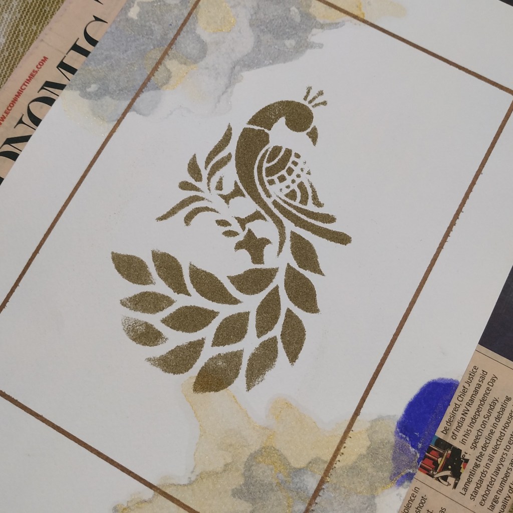 2. Embossing – The process of embossing is very simple. The material quality matters. Earlier embossing techniques and materials were not that great and they looked very messy, more like a beginner’ school project. We have now started getting good quality embossing glue and embossing powders. We apply glue using the stencil and then dust it with the embossing powder. The glue is either dabbed onto the surface or applied with a brush. The excess powder falls off once it dries. It is the same method of sticking glitter powders. The difference is in setting embossing powders. An embossing heat gun is used to set the powder. The powder melts due to the heat and binds to the paper.