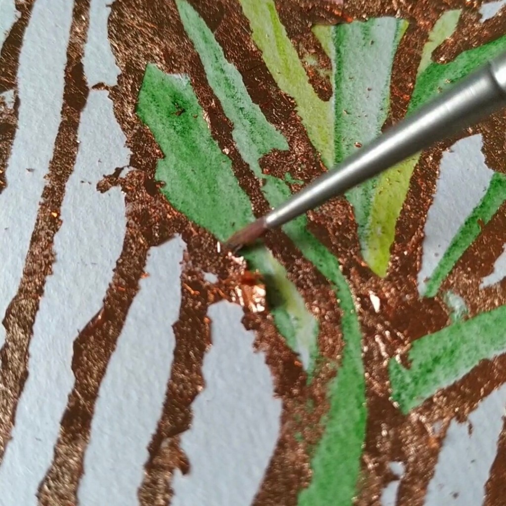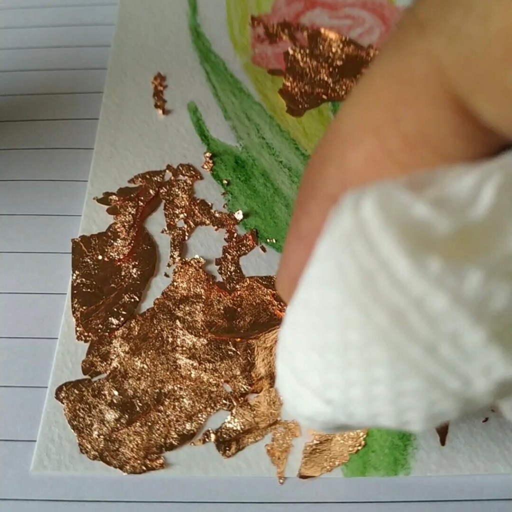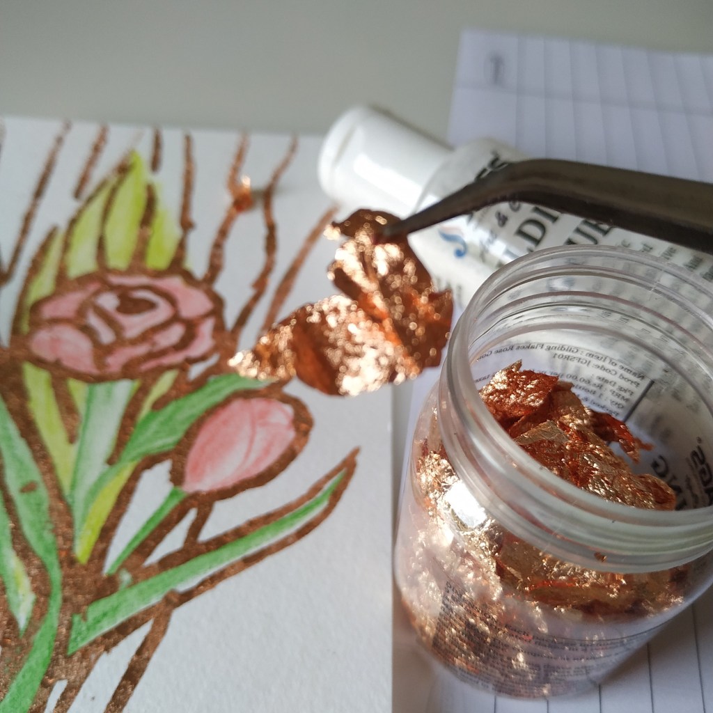 Next, let’s discuss the process. The process is simple. We apply the gilding glue using a brush. It becomes transparent as it dries. It is tacky or sticky for a few hours once it dries. Carefully transfer or lay the sheet on top of the artwork. The foil will automatically stick to this sticky base. Areas in excess where the glue was not applied but the foil fell can be dusted off later.