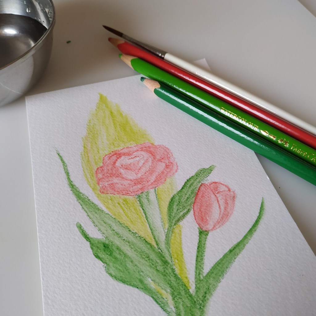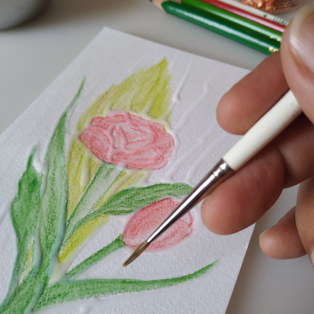 I tried it on a small postcard first to understand how to use the material. You could do that too. For the background, I drew flowers using watercolour pencils. I am aware that we do get a home-use heat press that works on this principle and gives a more professional finish. The print is like glue, we then insert the foil with the paper in the heat press which sticks the foil to it. I had that machine earlier as a kid. The finishing that I could manage with the heat press was similar to the one that I managed here when I did the process by hand.